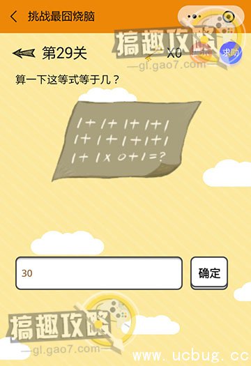 挑战最囧烧脑第29关怎么过?下面就分享微信挑战最囧烧脑第29关攻略给大家,希望这篇攻略对小伙伴有所帮助。 挑战最囧烧脑第29关攻略: 算一下这等式等于几? 主要是拐角处是11,第一个拐角和第二个拐角,所以这道题目为8+11+11=30