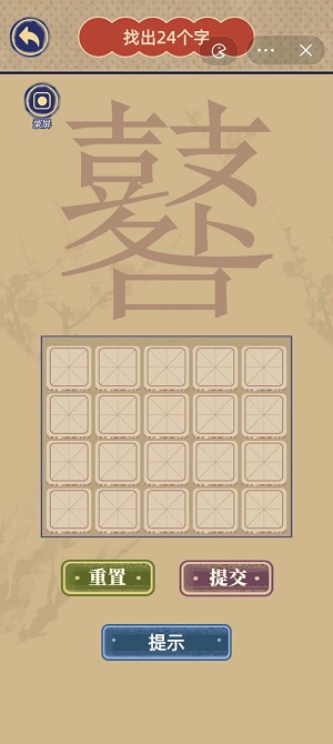 在本关卡的“鼛”字中,玩家一共可以找到28个字汉字,甚至更多,大部分都是常见的汉字,只需要点击对应的笔画,选出正确汉字后提交,一共提交24个汉字即可通关。