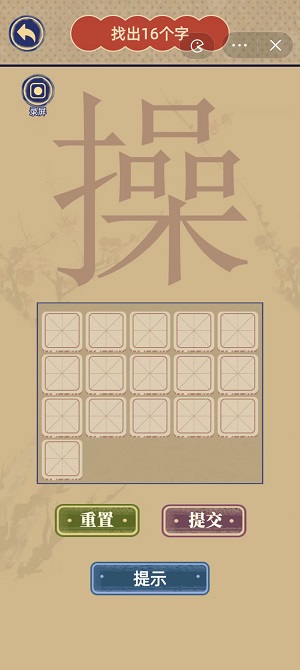在本关卡中,“操”字一共可以找出以上16个汉字,玩家根据上方给出的答案进行找字,成功找出汉字后提交,一共提交16个汉字即可通关。