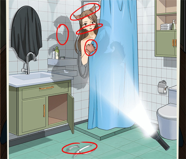4.点击白色毛发、狐狸耳朵、爪子、脸上的须子,点击浴室的柜子打开,移动手电筒可照到尾巴影子,点击手电筒照射的地方选中;