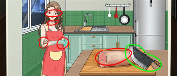 3.点击眼睛、脖子、指甲、手腕、肉完成后点击案板上的刀;
