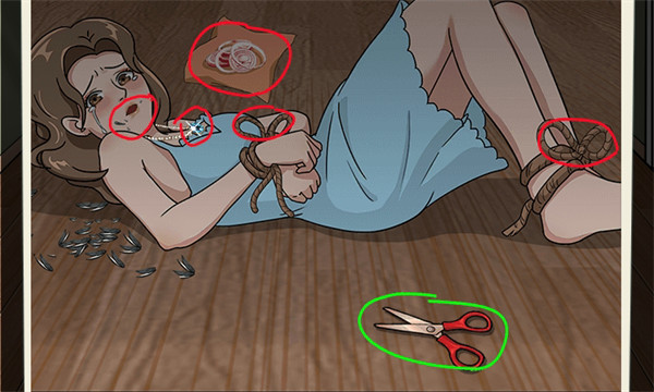 2.点击洋葱手帕、脸上的瓜子壳、项链和绑的蝴蝶结完成后将剪刀拖到妻子手处;
