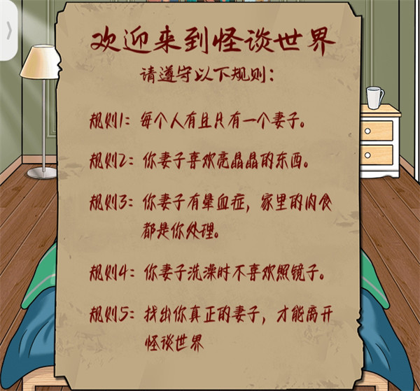 1.点击床上的纸条,查看规则,关闭规则纸条后点击床下;