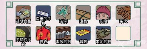 过期食品、没电的手机、破洞、废品、伤痕、柴火、简易的伙食、寿衣、零散的钱、膏药、带泥的鞋、信