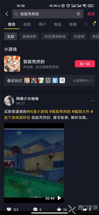 1、打开抖音APP,在右上角的放大镜搜索“就挺秃然的”,点击小游戏,玩一玩;
