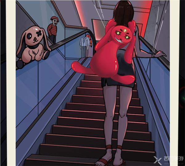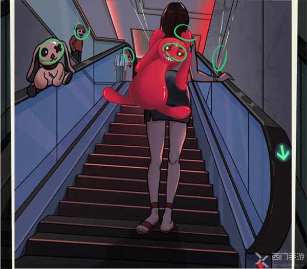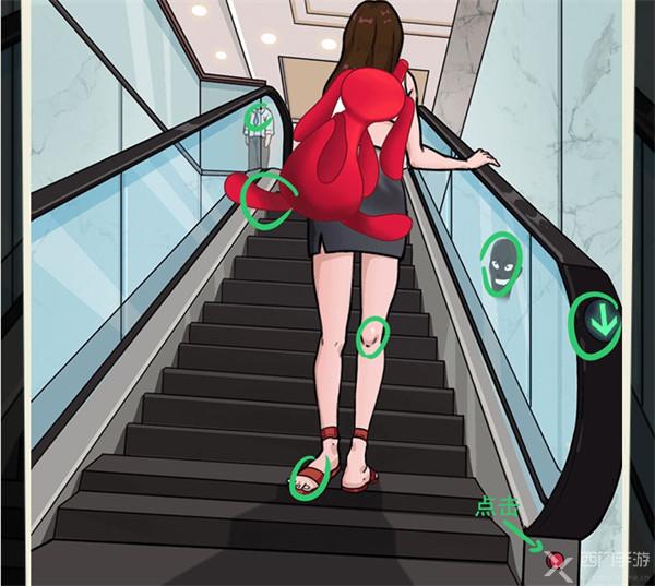 1、扶梯上方奇怪的人,女人的脚和膝盖,身上玩偶的脚,扶梯旁边的人脸,扶梯下行的标记,前面的选择完之后点击红色的按钮;
