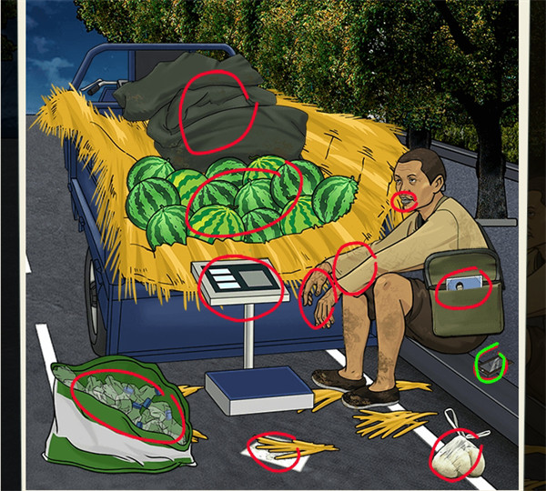3、车上的西瓜和被子,地上的馒头、塑料瓶、一张纸和秤,男人的嘴巴、手和长袖的衣服;