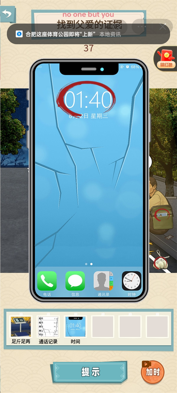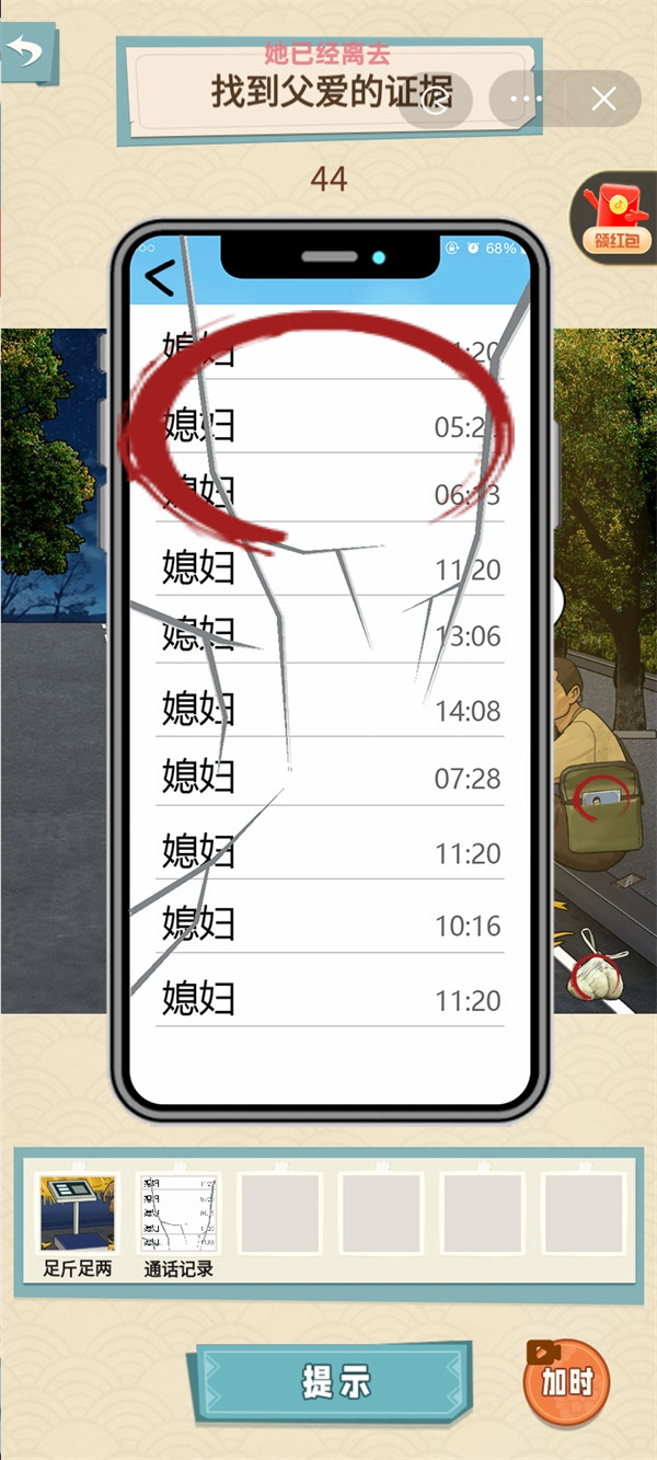 1、点开父亲身上的挎包,点击里面的照片;点击父亲旁边的手机,选择初始界面的时间;
