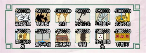 易碎浴缸-50W、破地板-50W、吊灯-100W、污水龙头-50W、生锈窗户25W、喷水马桶-100W、用过的沙发-50W、漏水冰箱-159900、魔音钢琴-25W、裂缝-50W、针孔摄像头-50W、样板间-100W;