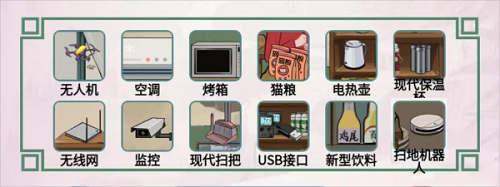 无人机、空调、烤箱、猫粮、电热壶、现代保温杯、无线网、监控、现代扫把、USB接口、新型饮料、扫地机器人;
