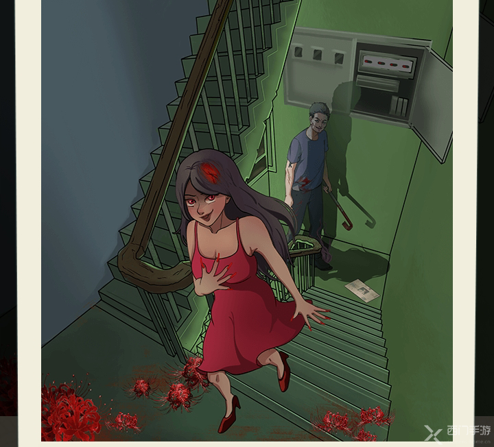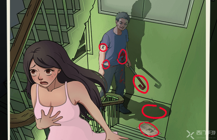 1、上划男人兜里的照片,点击露出的照片,上划勇人的袖子,点击露出的刺青,男人衣服上的血迹,手里的工具,地上的的影子和报纸,红圈事件完成后点击配电箱将其打开,下划电闸关灯;
