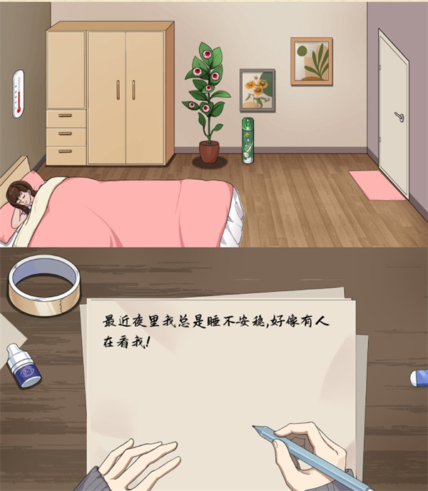 4、将真实世界(下图)桌上的眼药水拖到小说世界(上图)里的盆栽上;点击小说世界(上图)床上方的温度计,上滑温度计的温度调到40度。