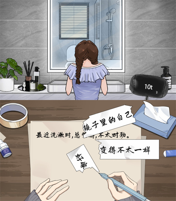 2、按“好像镜子里的自己变得不太一样”的顺序将小纸条拼好;将小说世界(上图)的锤子拖到小姐姐身上(注意不要太靠上方);