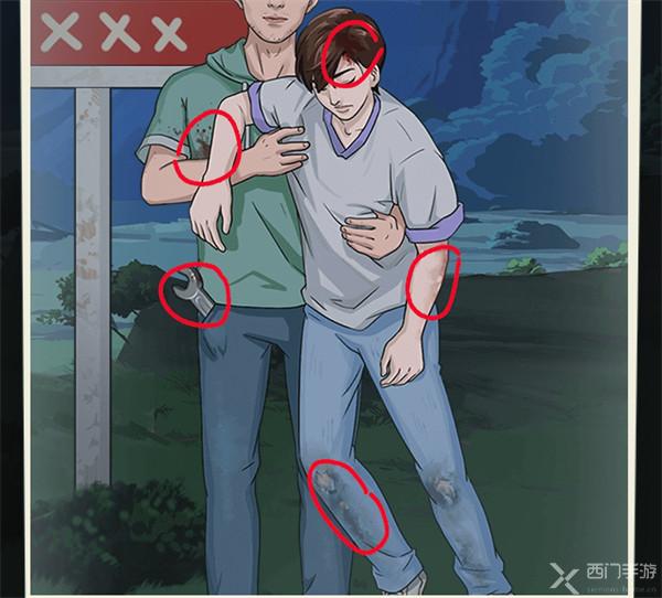 1、男人头上的伤口,手臂上诡异的斑点,身上的破裤子,另一个男人身上的血迹,口袋中的扳手,点击不开门;