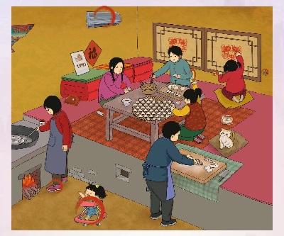 12、在桌子上,小女孩手边的饺子模具。
