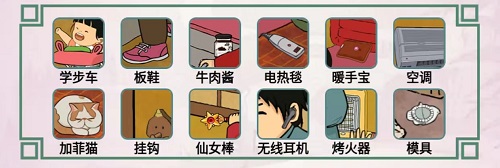 学步车、板鞋、牛肉酱、电热毯、暖手宝、空调、加菲猫、挂钩、仙女棒、无线耳机、烤火器、模具