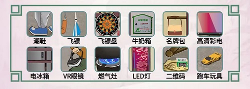 潮鞋、飞镖、飞镖盘、牛奶箱、名牌包、高清彩电、电冰箱、VR眼镜、燃气灶、LED灯、二维码、跑车玩具