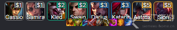 1、阵容成员:蛇女+沙弥拉+克烈+乌鸦+诺手=卡特琳娜+剑魔+塞恩