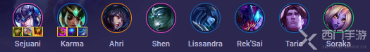 1、阵容成员:猪妹+卡尔玛+阿狸+慎+冰女+挖掘机+塔里克+索拉卡