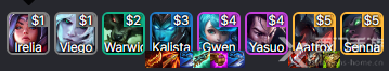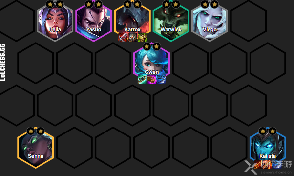 1、阵容成员:刀妹+佛耶戈+狼人+卡莉斯塔+格温+亚索+剑魔+赛娜