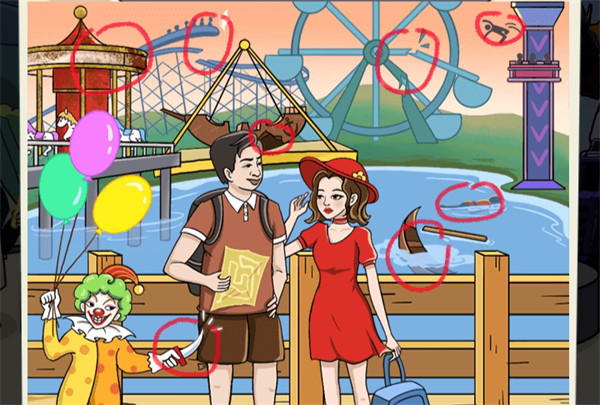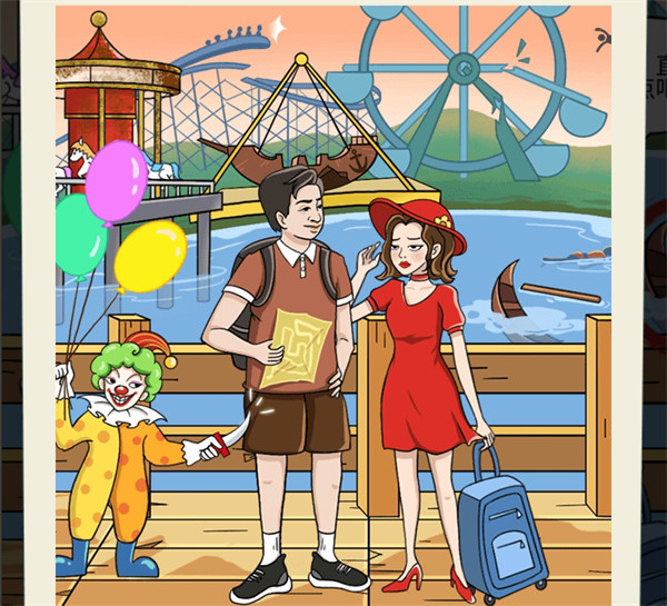 2.向右滑动小丑的手,露出拿刀的手,点击船两次、断裂的过山车、水里的船和人、摩天轮、跳楼机、旋转木马和海盗船;