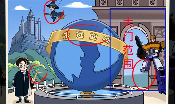 1.地球仪、魔法杖、哈利波特和机器人的腿,点击右侧大门,可切换场景;