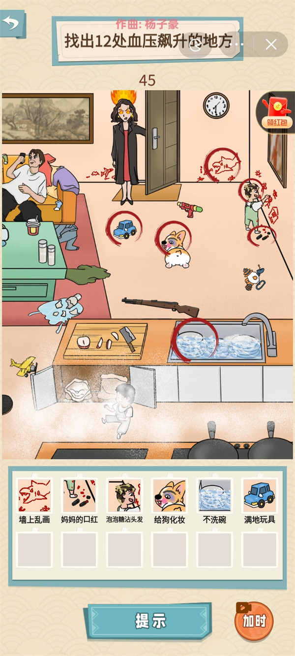 2、墙上乱画,玩妈妈的口红,泡泡糖沾头发,把狗向上滑动看到给狗化妆,不洗碗,满地玩具;
