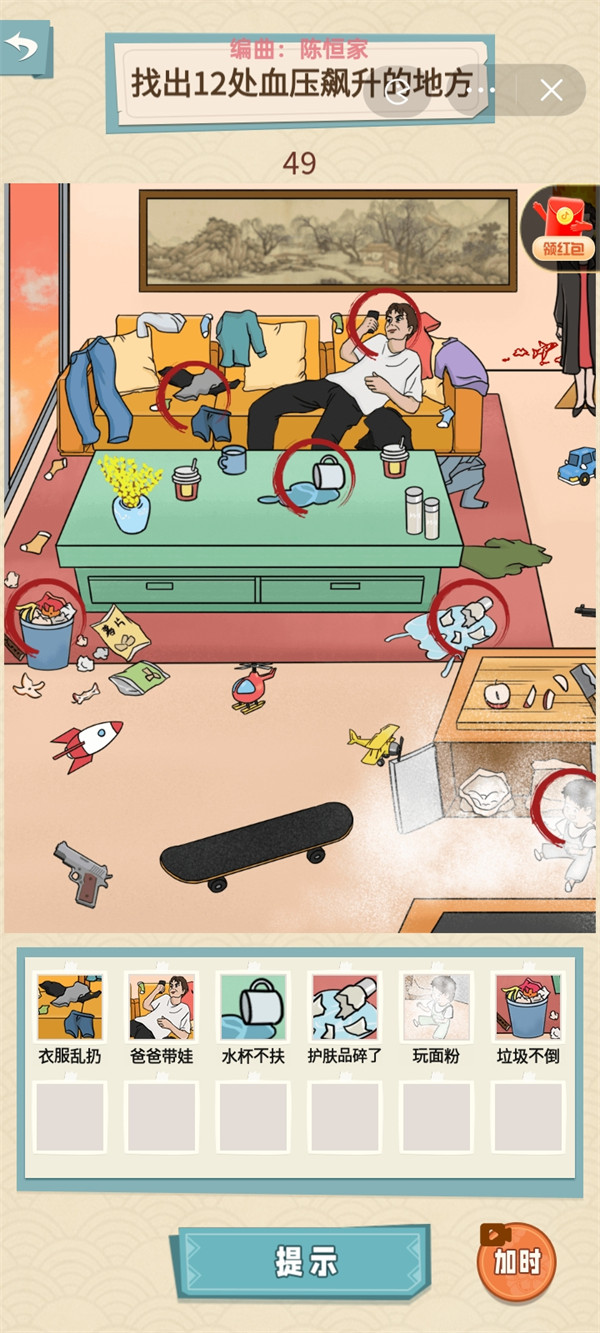 就挺秃然的是抖音软件中的一款小游戏,在其中有着各种各样的关卡来等着我们解锁,这里小编带来的是爸爸带娃“找出12处血压飙升的地方”这一关的攻略,快来看看吧。