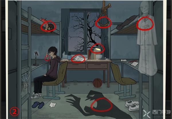 3、点击上铺的娃娃,点击台灯、点击桌子上的白纸、点击梯子上飘得白影,点击绳子;