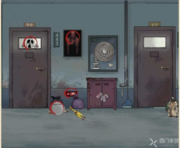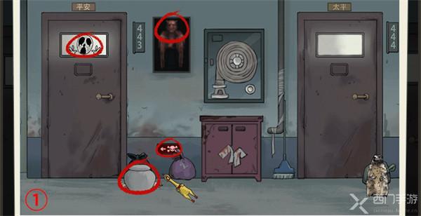 1、点击黑色垃圾袋出现坛子,点击左边门上的骷髅头,点击墙上的安全通道,点击门牌号旁边的照片,点击右边的门三次进入下一个场景;