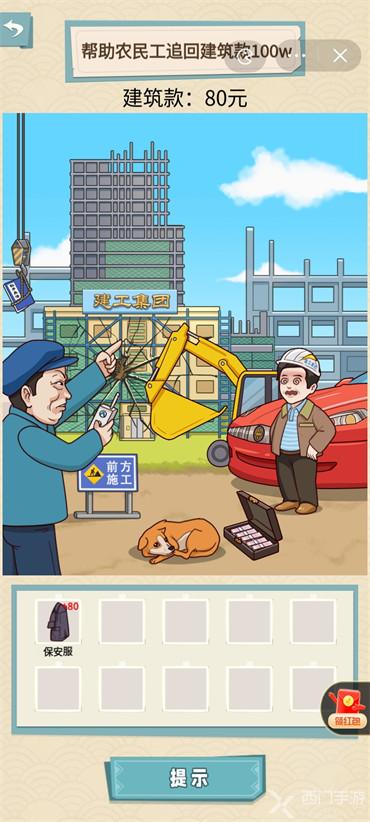 1.把保安服拖给狗。拖动锤子打强哥的头两次。拖动锤子打建筑两次,拿走强哥手中的钱,再次敲击建筑。