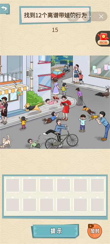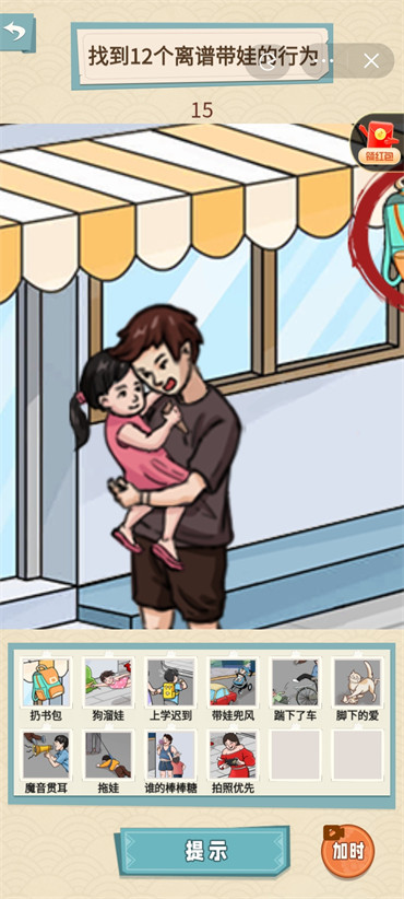 现在90后带娃的趋势很火爆,而就挺秃然的小游戏就推出了90后带娃“找到12个离谱带娃的行为”这一关卡要怎么过呢?现在就来看一下这关的通过攻略吧。