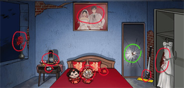 点击抽屉打开露出药瓶,左拖动右侧枕头露出结婚证,点击衣柜打开露出婚纱所有红圈事件后向下滑动出现的黄符,镜子破碎;选择碎裂处的保险单(绿圈处)。