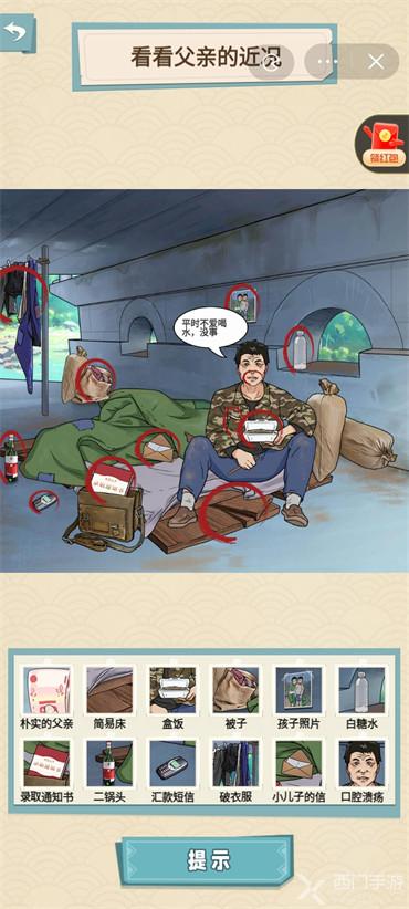 1.向上划动掀开被子,点击露出的儿子的信;5l天总的衣兜;向上滑动挎包,露出里面的录取通知书;