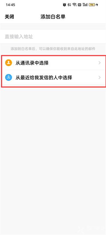 6.在添加白名单的页面中点击【从通讯录中选择】或【从最近给我发信的人中选择】;