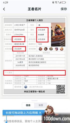 5、在生成的王者荣耀个人简历信息中,可以点击修改身份、在线时间段、是否语音、主玩位置、个性签名等,点击对应内容即可进行修改。