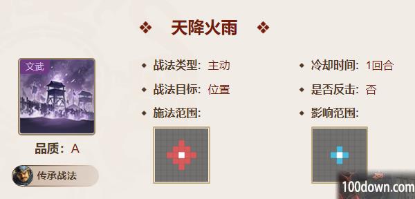 天降火雨:对范围内敌军群体造成56%~112%兵刃伤害,并造成【灼烧】:每回合受到28%~56%谋略伤害,持续2回合,可叠加。