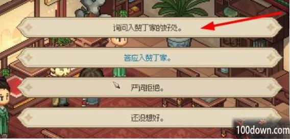 2、之后进入丁家内部,玩家要找到丁员外,玩家名声等级4级之后,给丁员外送礼100就会触发入赘的选项;