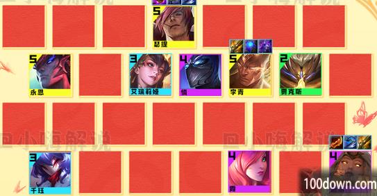 1、阵容组成:贾克斯、艾瑞莉娅、千珏、凯尔、慎、霞、李青、瑟提、永恩