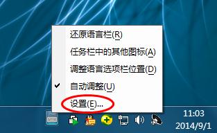 2、将鼠标放在输入法图标上,单击右键,点击选择“设置”,如下图所示:
