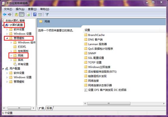 2.在打开的本地组策略编辑器中,依次展开计算机配置 – 管理模板 – 网络。如下图所示